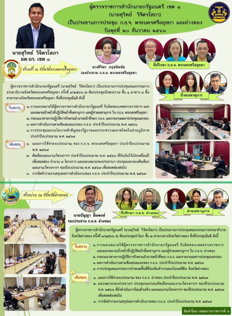 วันพุธที่ 20 ธันวาคม 2566 ผู้ตรวจราชการสำนักนายกรัฐมนตรี (นายสุวิทย์ วิจิตรโสภา) เป็นประธานการประชุมคณะกรรมการธรรมาภิบาลจังหวัด