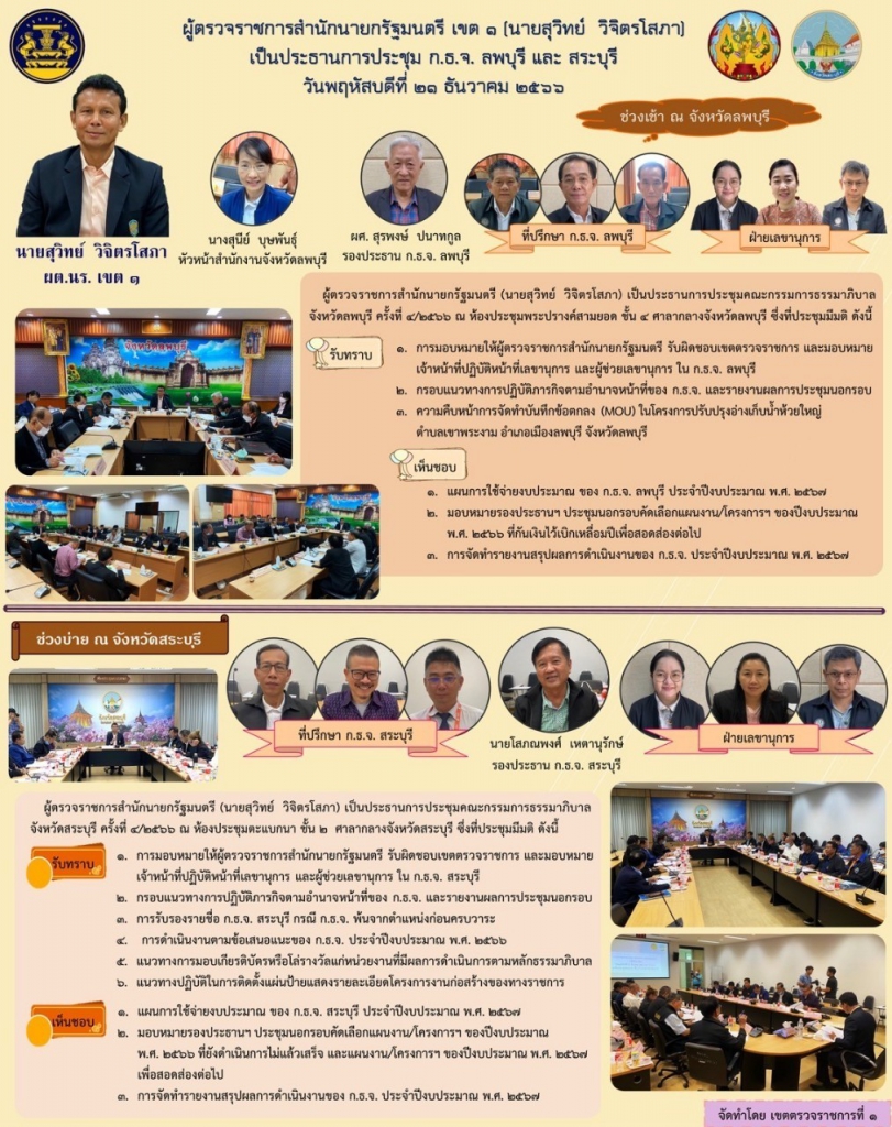 วันพฤหัสบดีที่ 21 ธันวาคม 2566 ผู้ตรวจราชการสำนักนายกรัฐมนตรี (นายสุวิทย์ วิจิตรโสภา) เป็นประธานการประชุมคณะกรรมการธรรมาภิบาลจังหวัด