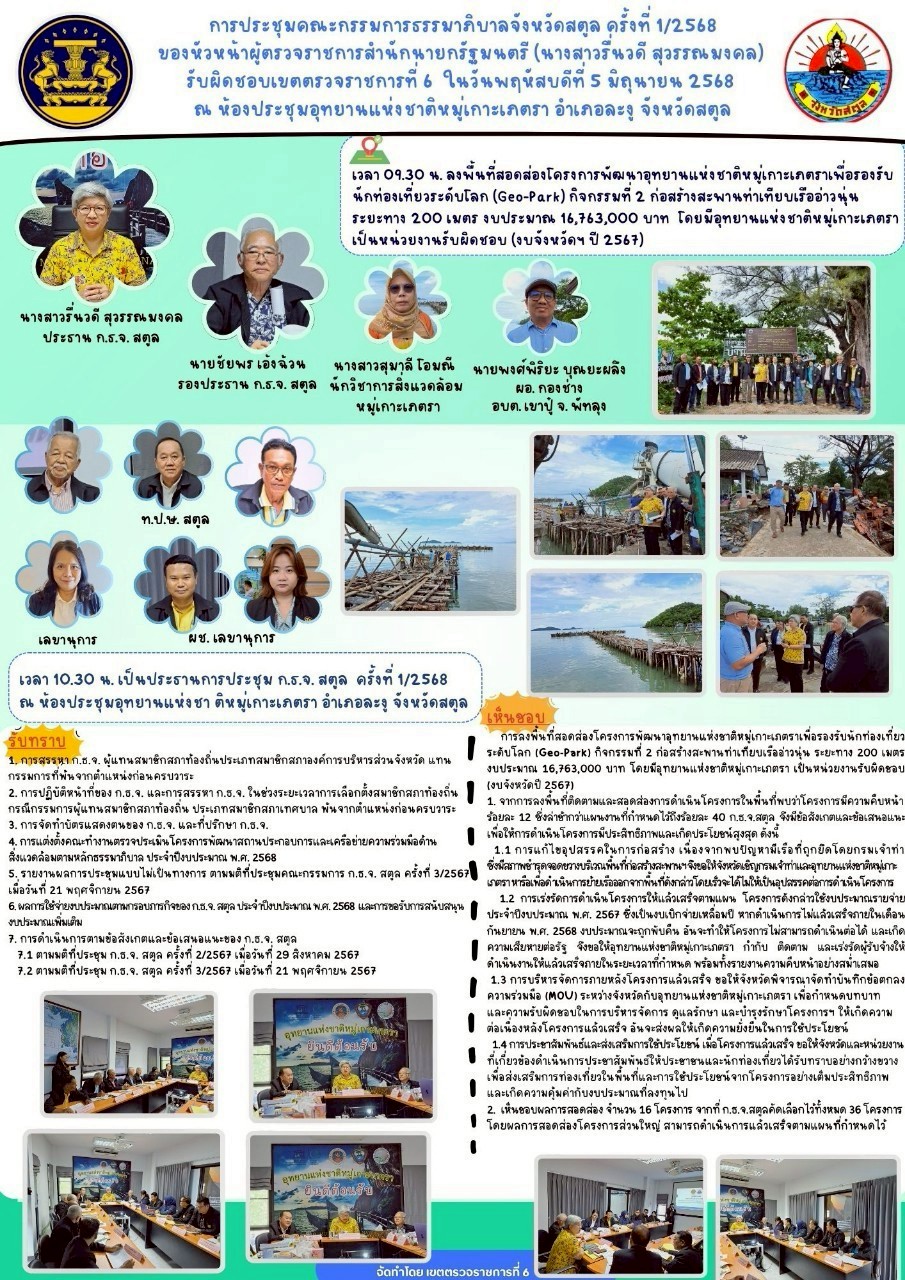 เวลา 10.30 น. เป็นประธานการประชุม ก.ธ.จ. สตูล ครั้งที่ 1/2568 ณ ห้องประชุมอุทยานแห่งชาติหมู่เกาะเภตรา อำเภอละงู จังหวัดสตูล