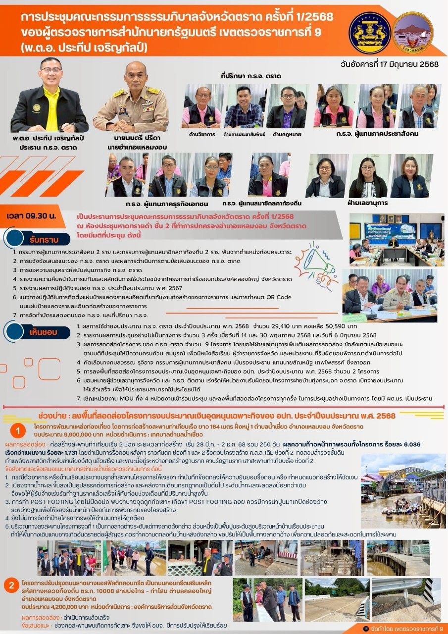 วันอังคารที่ 17 มิถุนายน 2568 เวลา 09.30 น. ผู้ตรวจราชการสำนักนายกรัฐมนตรี เขตตรวจราชการที่ 9 (พ.ต.อ. ประทีป เจริญกัลป์) เป็นประธานการประชุมคณะกรรมการธรรมาภิบาลจังหวัดตราด ครั้งที่ 1/2568 ณ ห้องประชุมหาดทรายดำ ชั้น 2 ที่ทำการปกครองอำเภอแหลมงอบ จังหวัดตราด ทั้งนี้ ในช่วงบ่ายได้ลงพื้นที่สอดส่องโครงการงบประมาณเงินอุดหนุนเฉพาะกิจของ อปท. ประจำปีงบประมาณ พ.ศ. 2568 จำนวน 2 โครงการ ดังนี้