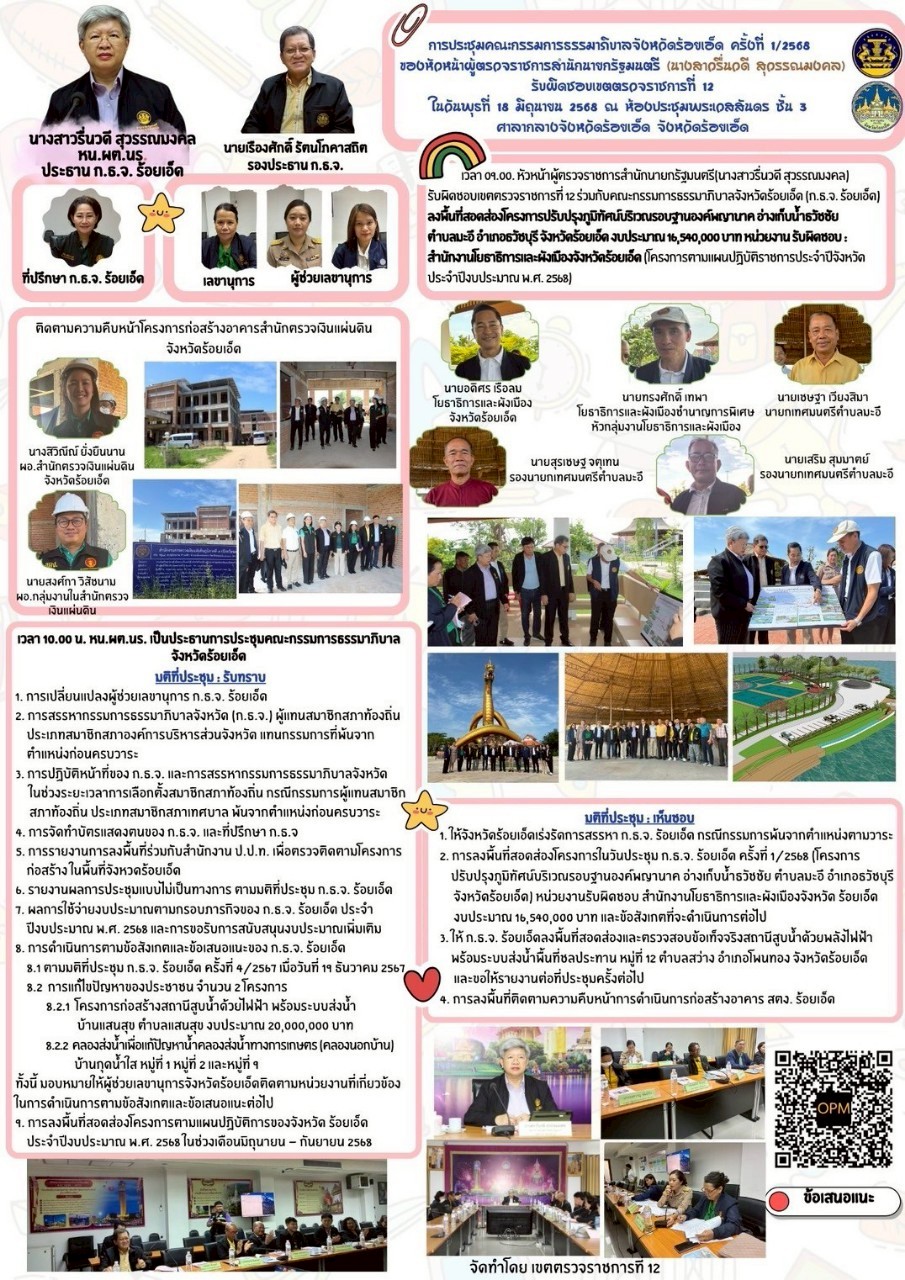 เวลา 09.00. หัวหน้าผู้ตรวจราชการสำนักนายกรัฐมนตรี(นางสาวรื่นวดี สุวรรณมงคล) รับผิดชอบเขตตรวจราชการที่ 12 ร่วมกับคณะกรรมการธรรมาภิบาลจังหวัดร้อยเอ็ด (ก.ธ.จ. ร้อยเอ็ด) ลงพื้นที่สอดส่องโครงการปรับปรุงภูมิทัศน์บริเวณรอบฐานองค์พญานาค อ่างเก็บน้ำธวัชชัย ตำบลมะอึ อำเภอธวัชบุรี จังหวัดร้อยเอ็ด งบประมาณ 16,540,000 บาท หน่วยงาน รับผิดชอบ : สำนักงานโยธาธิการและผังเมืองจังหวัดร้อยเอ็ด (โครงการตามแผนปฏิบัติราชการประจำปีจังหวัด ประจำปีงบประมาณ พ.ศ. 2568) แลัติดตามความคืบหน้าโครงการก่อสร้างอาคารสำนักตรวจเงินแผ่นดินจังหวัดร้อยเอ็ด