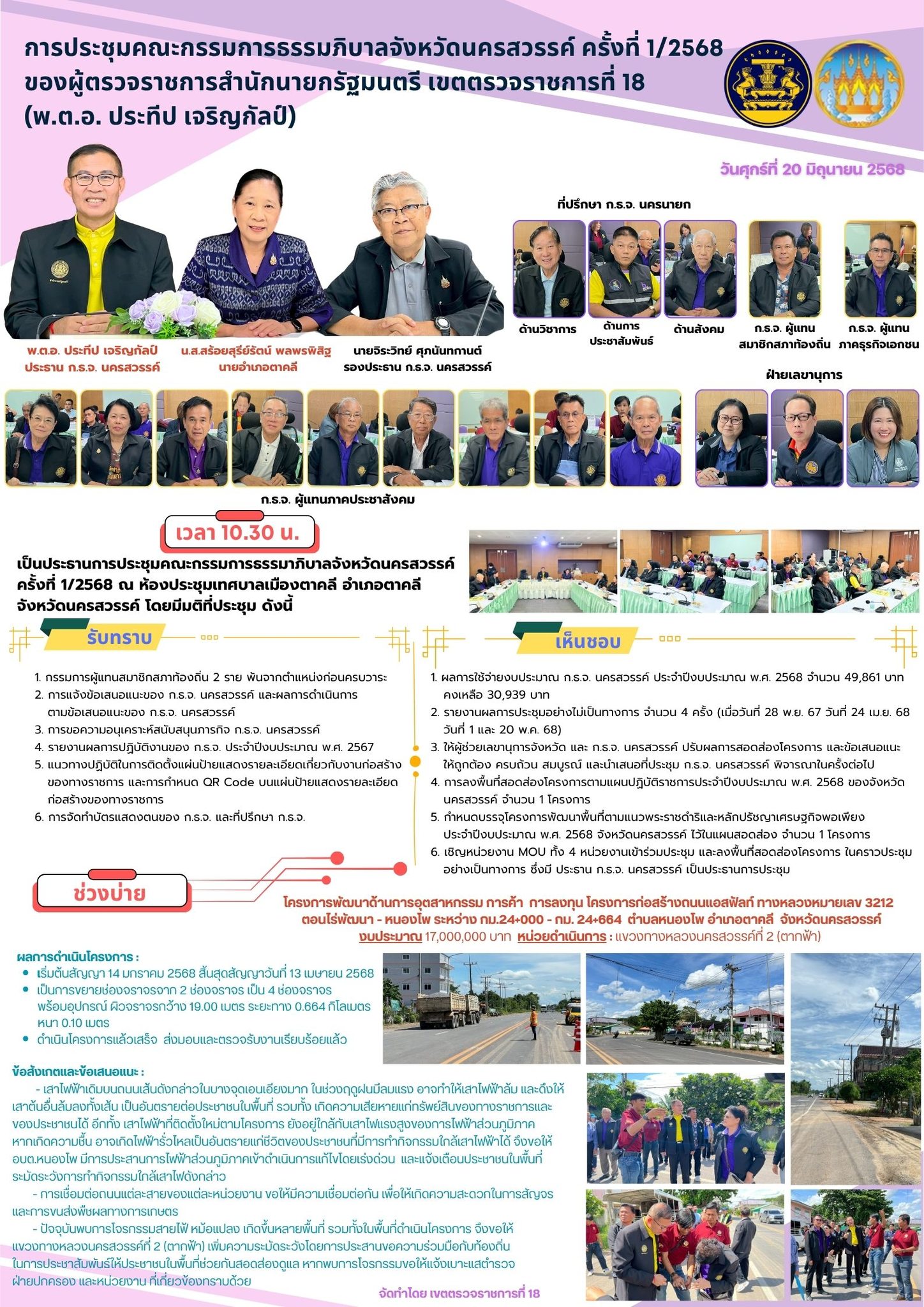 20 มิ.ย. 2568 วันศุกร์ที่ 20 มิถุนายน 2568 เวลา 10.30 น. ผู้ตรวจราชการสำนักนายกรัฐมนตรี เขตตรวจราชการที่ 18 (พ.ต.อ. ประทีป เจริญกัลป์) เป็นประธานการประชุมคณะกรรมการธรรมาภิบาลจังหวัดนครสวรรค์ ครั้งที่ 1/2568 ณ ห้องประชุมเทศบาลเมืองตาคลี อำเภอตาคลี จังหวัดนครสวรรค์ ทั้งนี้ ในช่วงบ่ายลงพื้นที่สอดส่องโครงการร่วมกับ ก.ธ.จ. นครสวรรค์ โครงการพัฒนาด้านการอุตสาหกรรม การค้า การลงทุน โครงการก่อสร้างถนนแอสฟัลท์ ทางหลวงหมายเลข 3212 ตอนไร่พัฒนา - หนองโพ ระหว่าง กม.24+000 - กม. 24+664 ตำบลหนองโพ อำเภอตาคลี จังหวัดนครสวรรค์