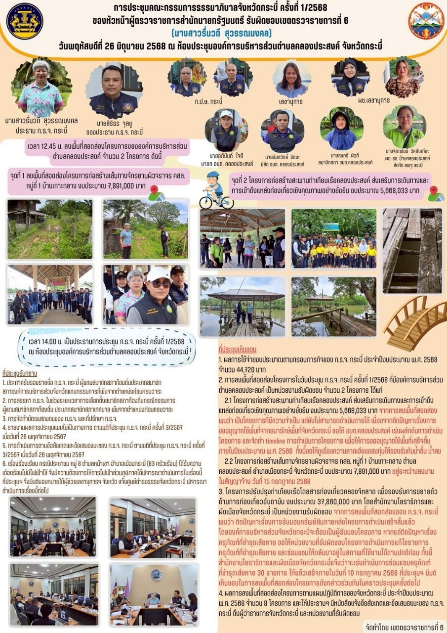 4. ผลการลงพื้นที่สอดส่องโครงการตามแผนปฏิบัติการของจังหวัดกระบี่ ประจำปีงบประมาณ พ.ศ. 2568 จำนวน 8 โครงการ และให้ประธานฯ มีหนังสือแจ้งข้อสังเกตและข้อเสนอแนะของ ก.ธ.จ. กระบี่ ถึงผู้ว่าราชการจังหวัดกระบี่ และหน่วยงานที่รับผิดชอบ