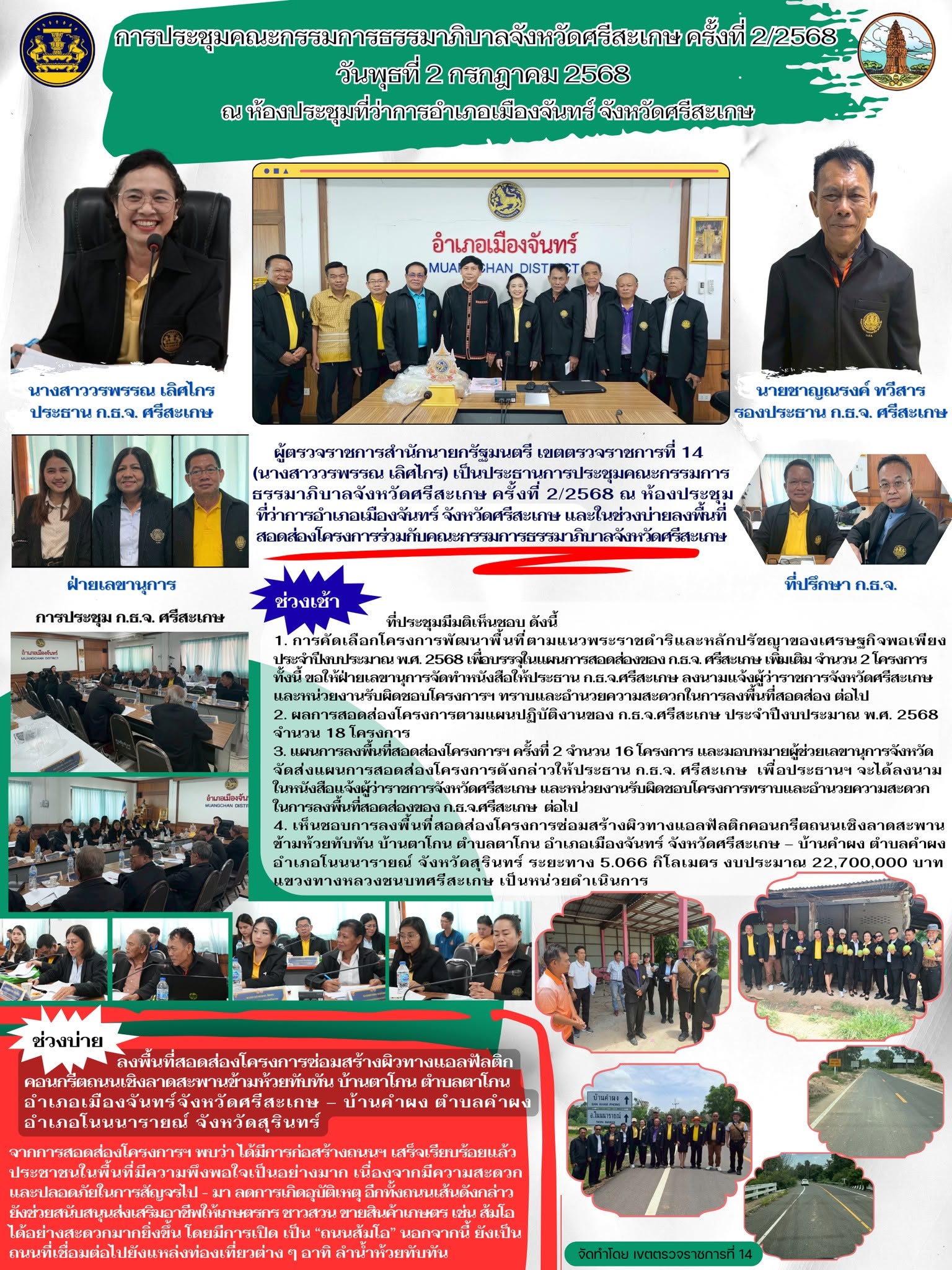 ผู้ตรวจราชการสำนักนายกรัฐมนตรี เขตตรวจราชการที่ 14 (นางสาววรพรรณ เลิศไกร) เป็นประธานการประชุมคณะกรรมการธรรมาภิบาลจังหวัดศรีสะเกษ ครั้งที่ 2/2568 ณ ห้องประชุมที่ว่าการอำเภอเมืองจันทร์ จังหวัดศรีสะเกษ และในช่วงบ่ายลงพื้นที่สอดส่องโครงการร่วมกับคณะกรรมการธรรมาภิบาลจังหวัดศรีสะเกษ